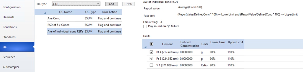 The SSUM (Sample Aggregate) QC option summarizes data for Average, Standard Deviation, %RSD, Minimum, and Maximum instead of individual measurement results. Multiple SSUM QCs can be defined and added to the same worksheet. For more information, see Sample Aggregate QC (SSUM). |